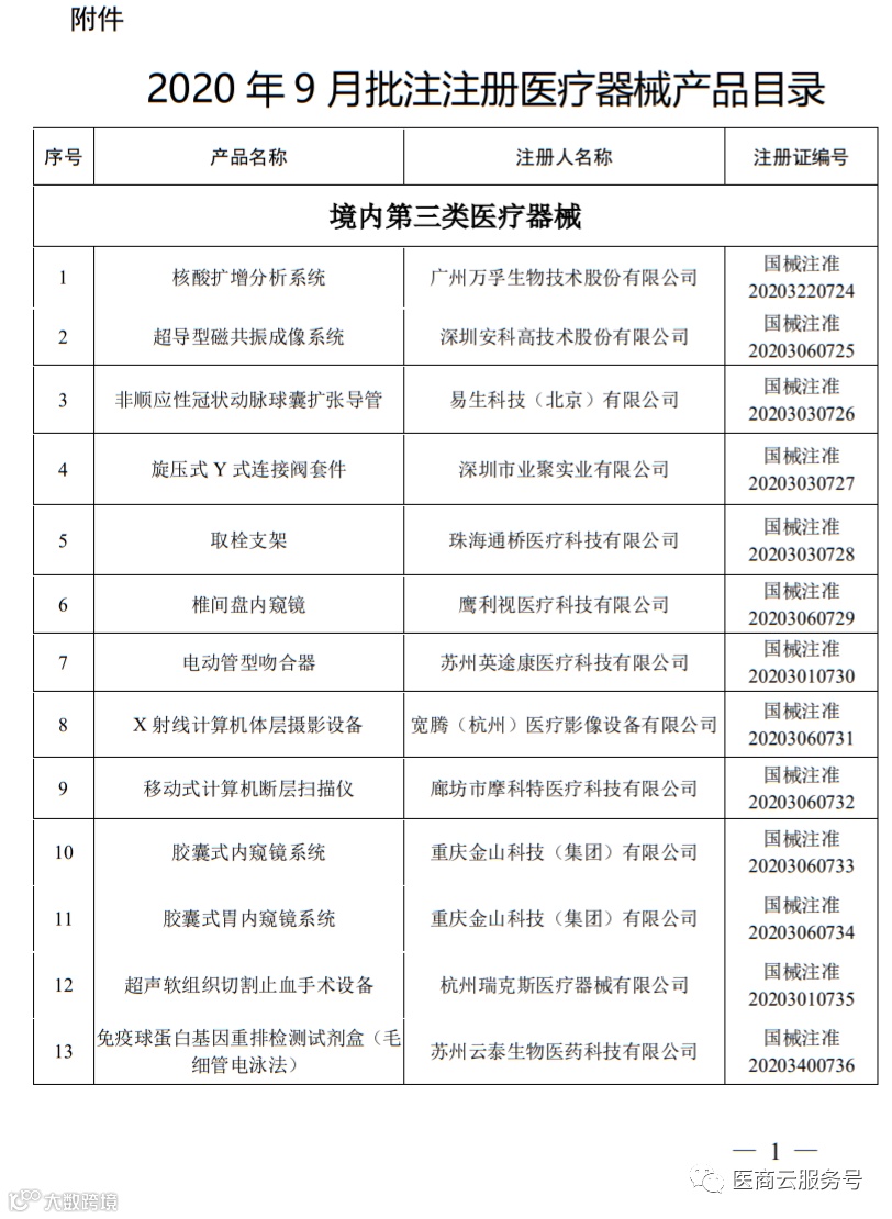 上述公告显示,2020年9月,国家药品监督管理局共批准注册医疗器械产品86个。其中,境内第三类医疗器械产品53个,进口第三类医疗器械产品16个,进口第二类医疗器械产品17个。