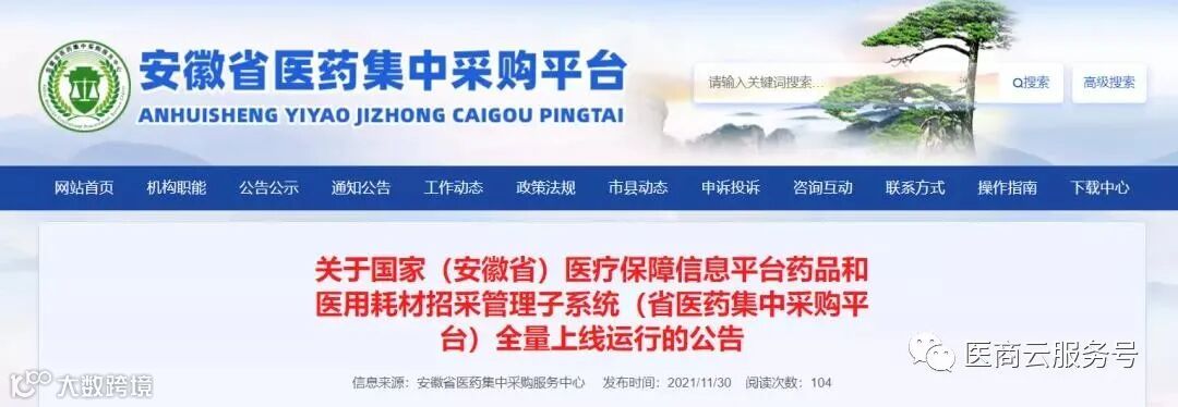据《公告》了解,国家(安徽省)医疗保障信息平台药品和医用耗材招采管理子系统(省医药集中采购平台,以下简称“新平台”),于2021年11月30日起全面上线运行。