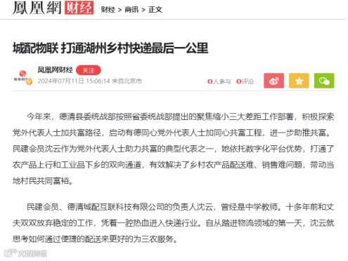7月11日 凤凰网《城配物联打通湖州乡村快递最后一公里》