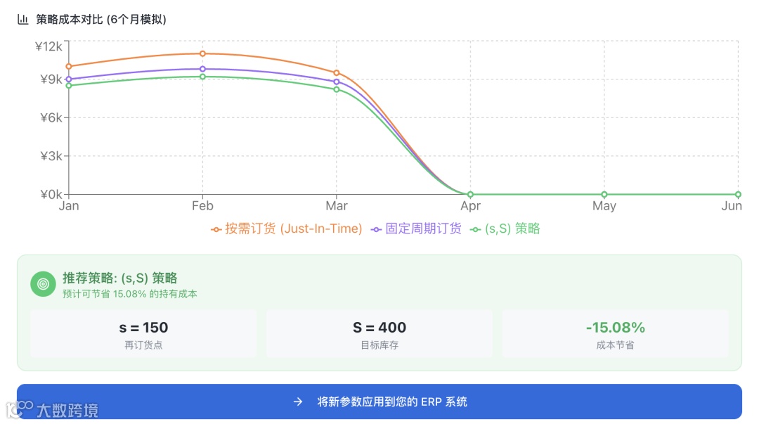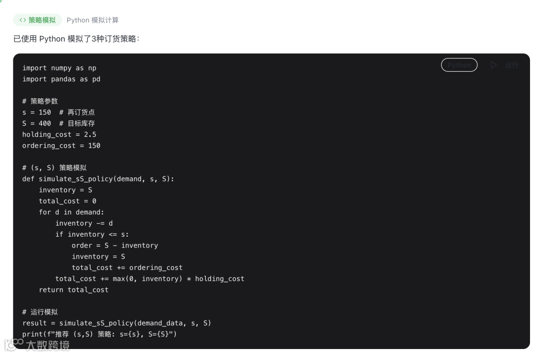 - 模型计算: (展示 Python 代码块和图表) "我模拟了按需订货、固定周期订货和 (s,S) 策略。建议采用(s,S) 策略,预计可节省 12% 的持有成本。点击此处将新参数应用到您的 ERP 系统。"