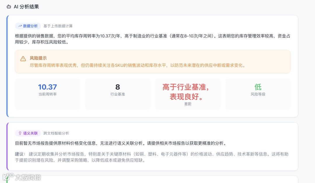 - 数据分析: "根据Excel计算,您的库存周转率为 4.5,而PDF报告指出行业基准为 6.2。您存在积压风险。"