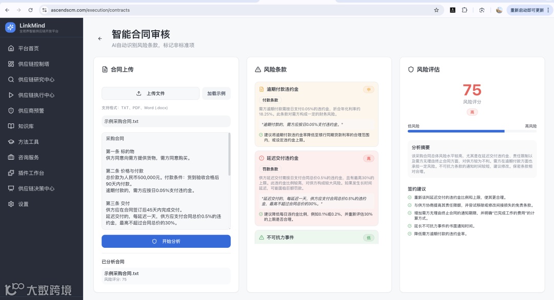 - 功能:自动审核数百页的采购合同,标记出关于“不可抗力”或“罚款条款”中的非标准风险项。