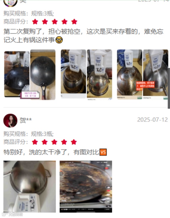 锅具炉灶等各种不锈钢上的焦渍烧黑,只要用它擦一擦,都可以轻松去除,焕然一新!实打实的客户评价图~