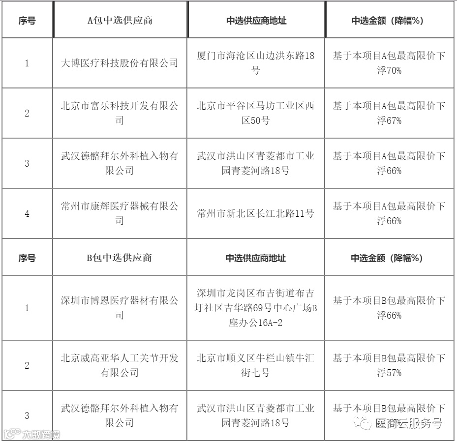 通过公开遴选、竞标、议价等环节,最终4家企业入围骨科植入(脊柱)类耗材供应商,3家企业入围骨科植入(关节)类耗材供应商,脊柱类耗材最高降幅70%,关节类耗材最高降幅66%。
