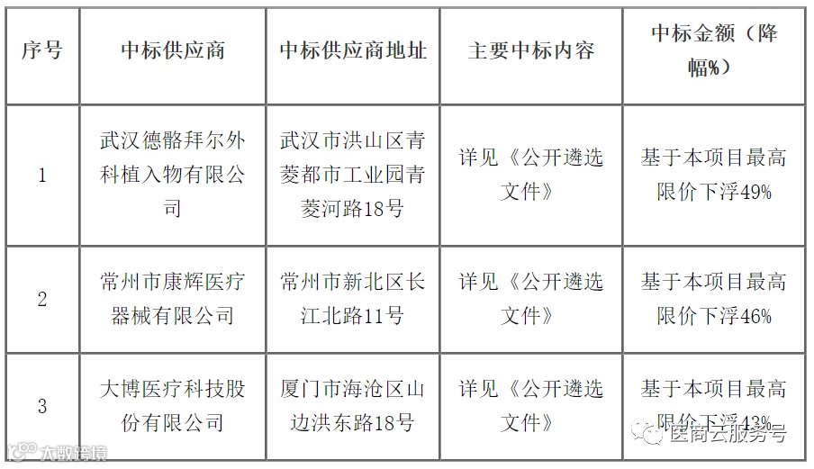 上述公告显示,大博医疗、常州市康辉医疗、武汉德骼拜尔三家企业中标,中标价格基于项目最高限价分别下降43%、46%和49%。