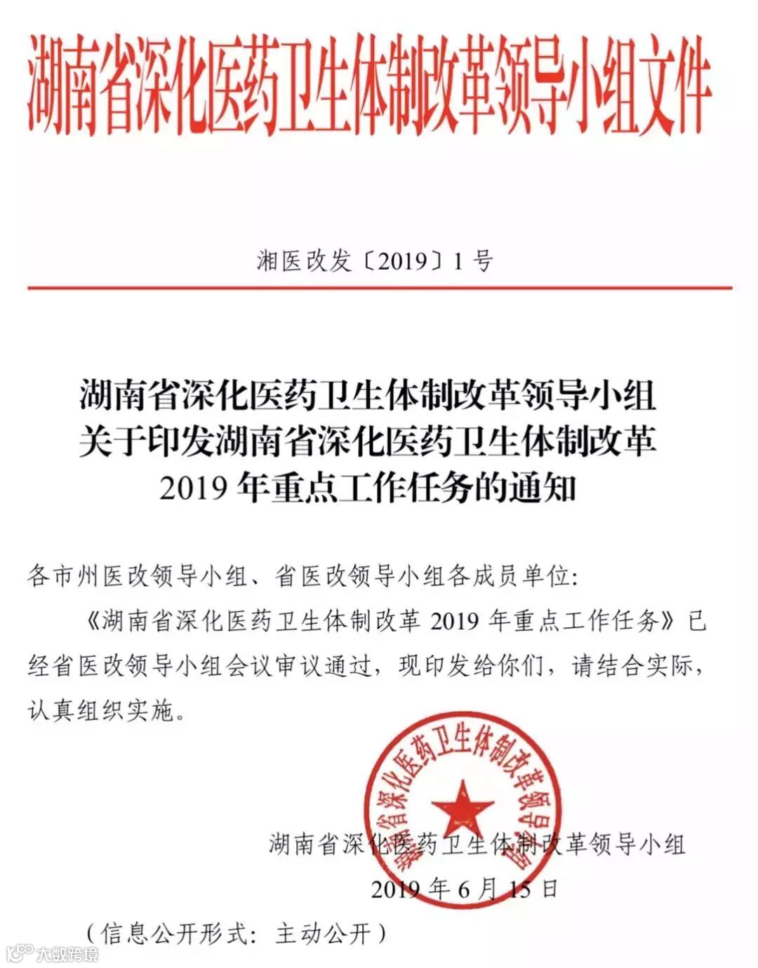 7月2日,湖南省卫健委发布《深化医药卫生体制改革2019年重点工作任务》(湘医改发〔2019〕1号)的文件。