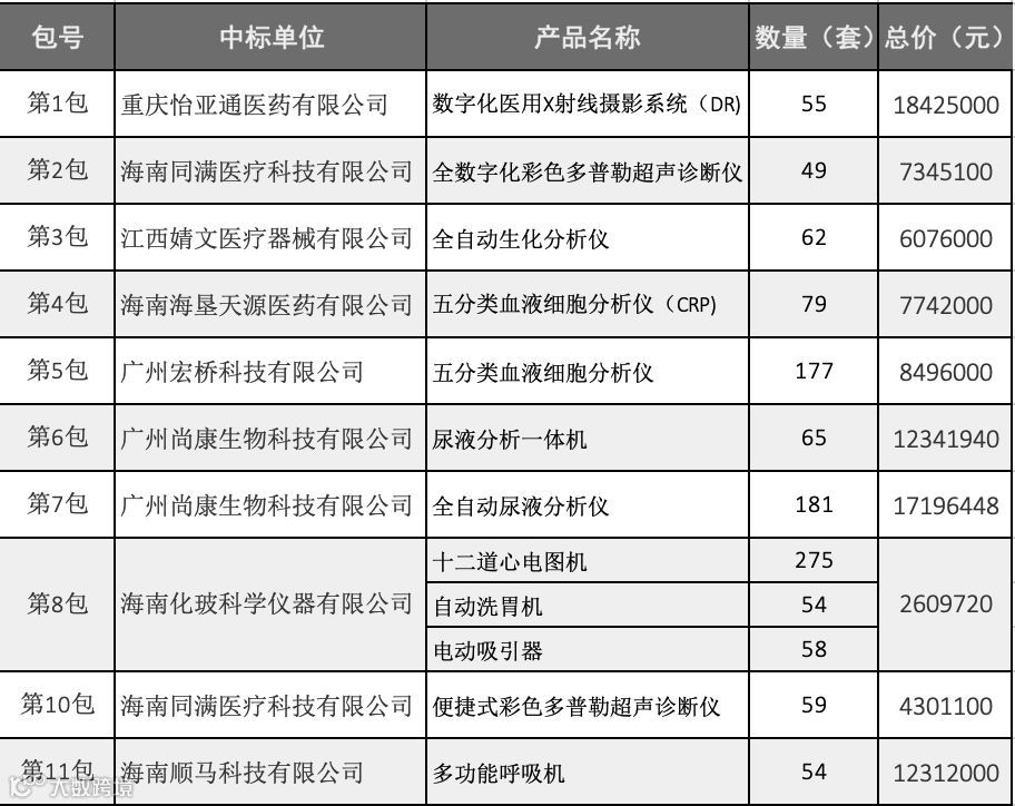 数据来源:海南省政府采购中心《关于海南省基层医疗卫生机构标准化建设医疗设备采购项目公告》、《中标公告》