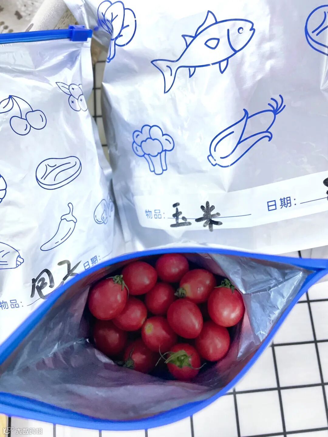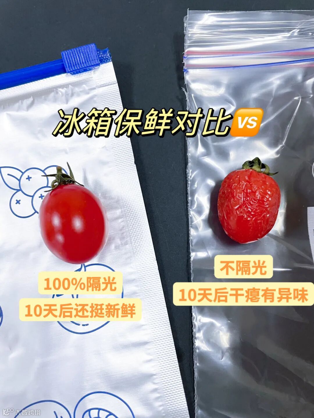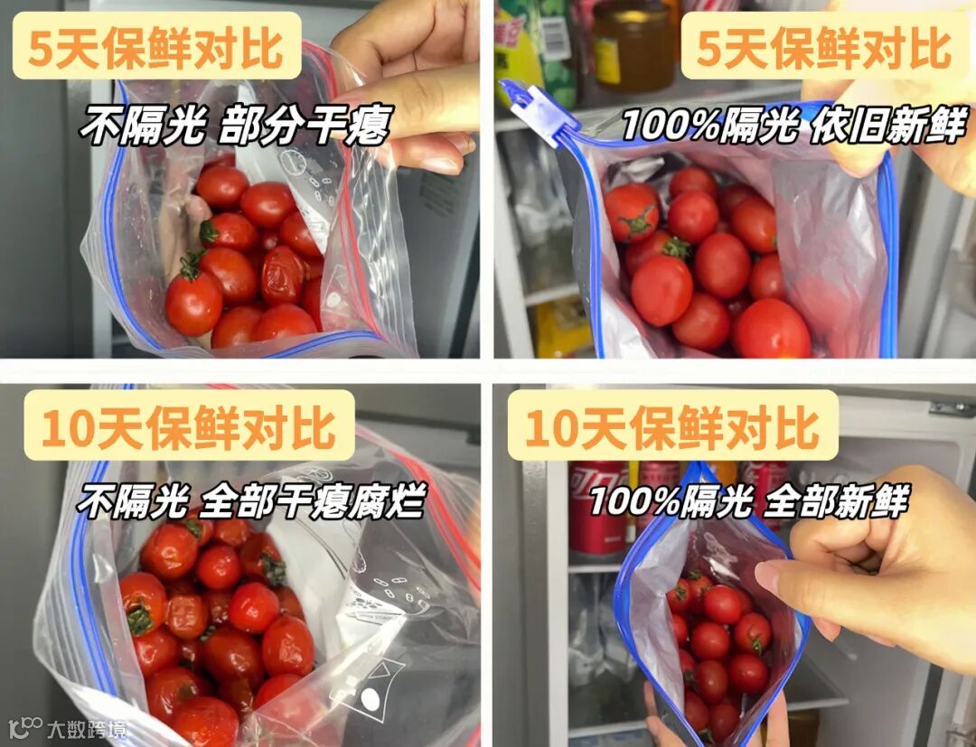 为了让大家看到直观的效果,我们还专门做了实验。拿一盒圣女果,一袋用铝箔保鲜袋储存,另一袋用普通保鲜袋储存。