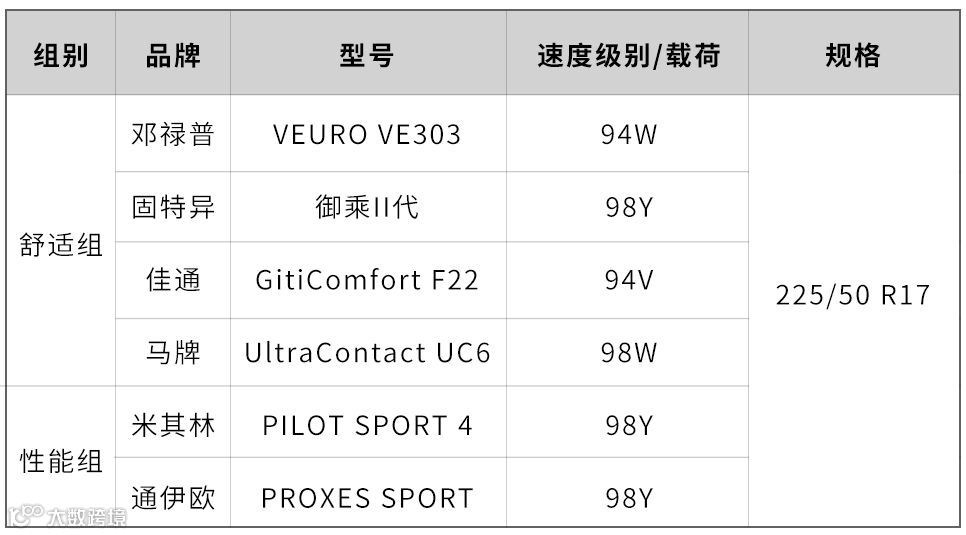 参与本次测试的共有6款轮胎,其中米其林与通伊欧都是主打性能的轮胎,而其余四款轮胎主打舒适性。为了保证测试的公平性,这6套轮胎的规格均为225/50 R17,将它们分成舒适组和性能组,具体分组见下表。