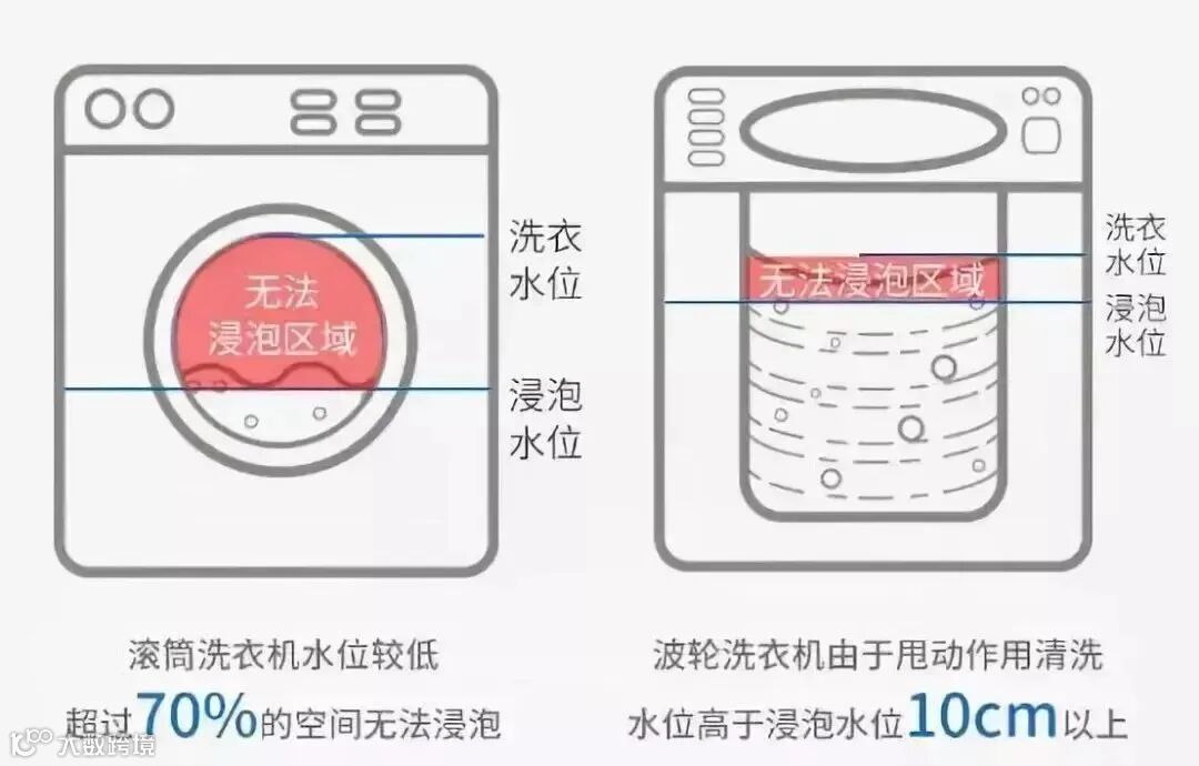波轮洗衣机滚筒比蕞高水位要高,即使加满了水,上面的位置还是浸泡不到。
