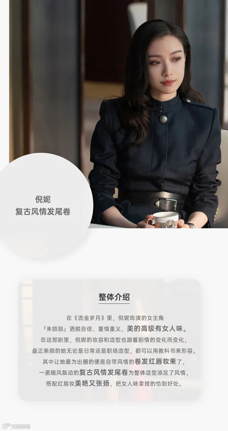 在《流金岁月》里,倪妮饰演的女主角「朱锁锁」重情重义、高级有女人味,其中的复古风情发尾卷造型更是让她美的“大杀四方”!今天小编就来手把手教你们这个美艳又张扬,同时又非常适用于职场生活和重要场合的造型吧!