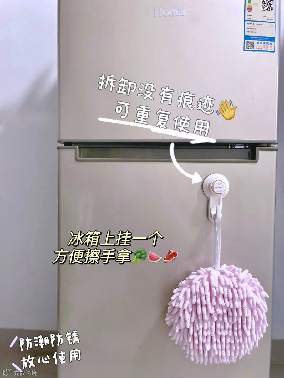 除了用它来收纳家庭用具,还可以吸在冰箱前挂一个擦手球,从冰箱里拿食材方便擦手,不用浪费纸巾。