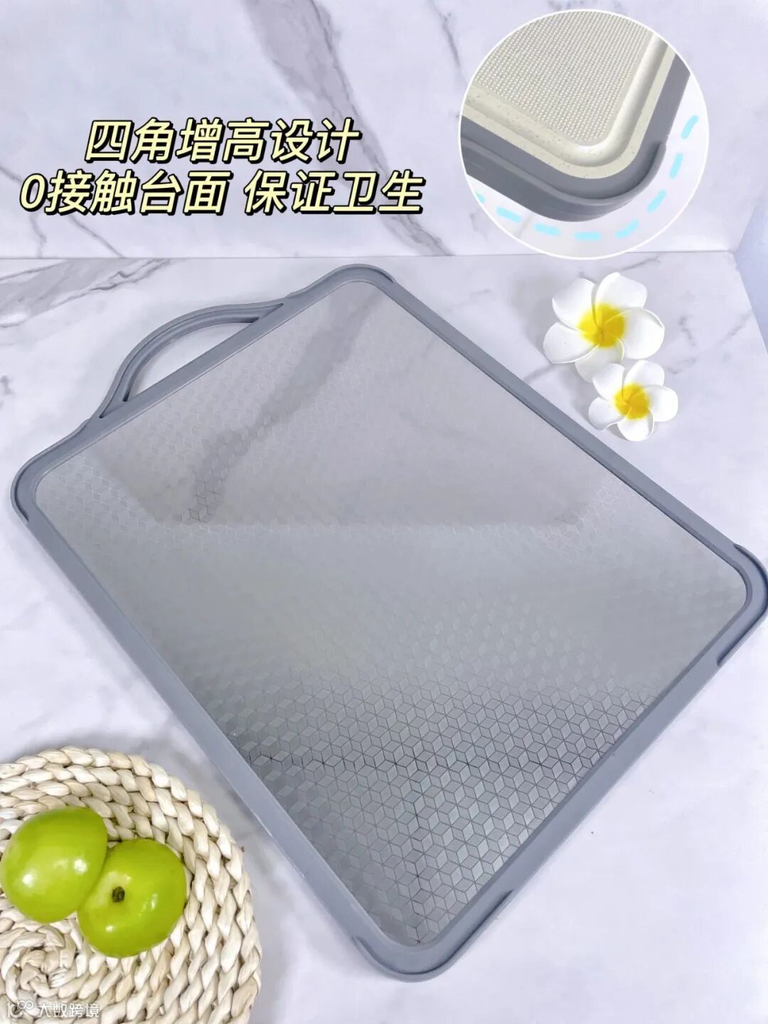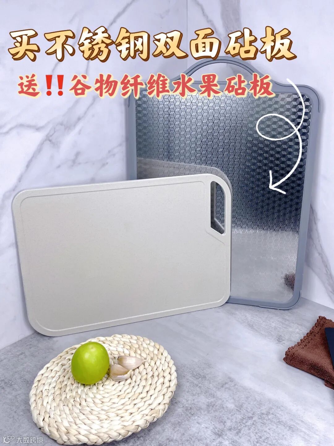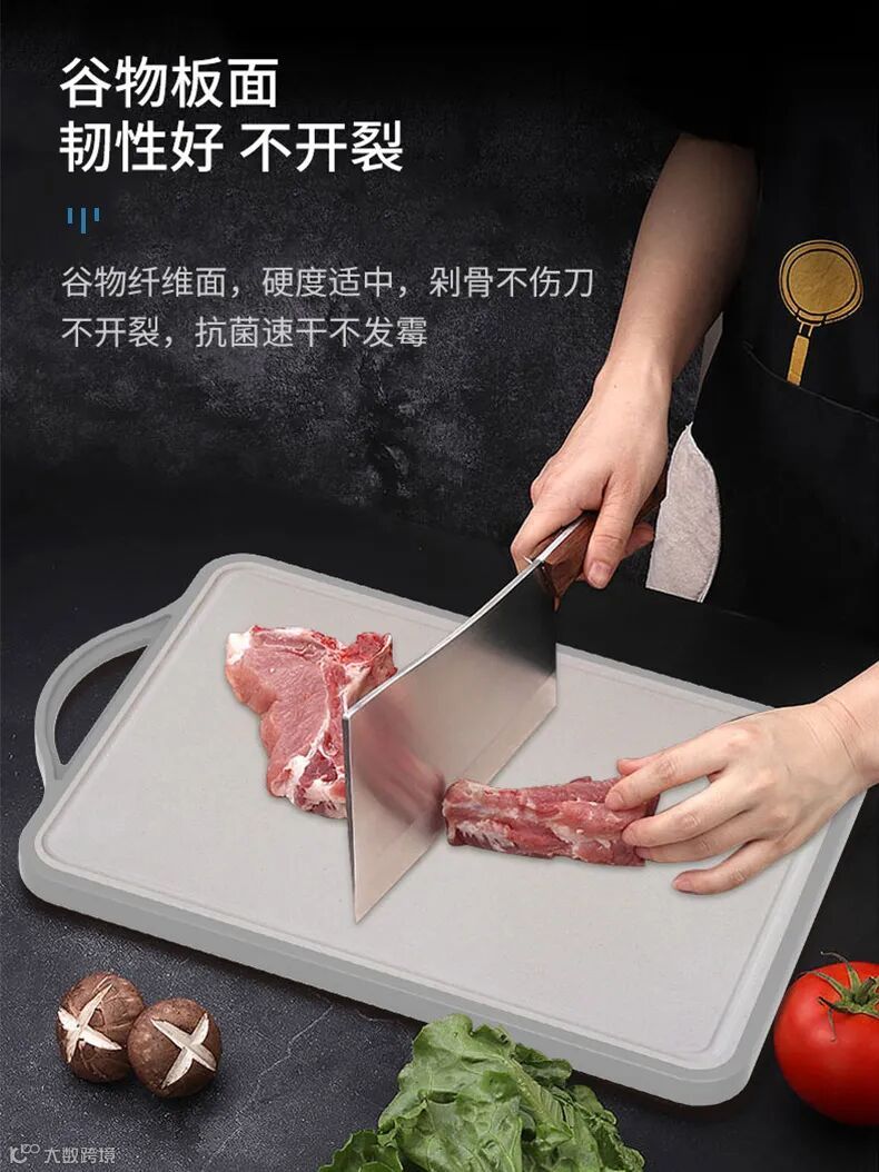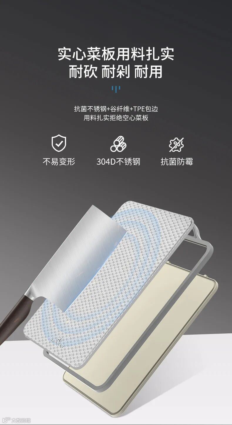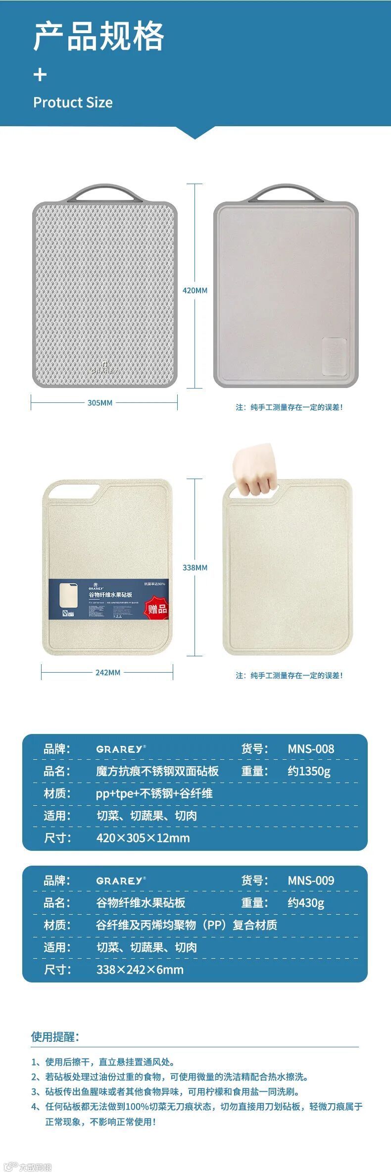 一面是304D不锈钢,另一面是小麦纤维材质,TPR的包边,完美配合生熟分离,双面可用,享受做饭,安心吃饭。