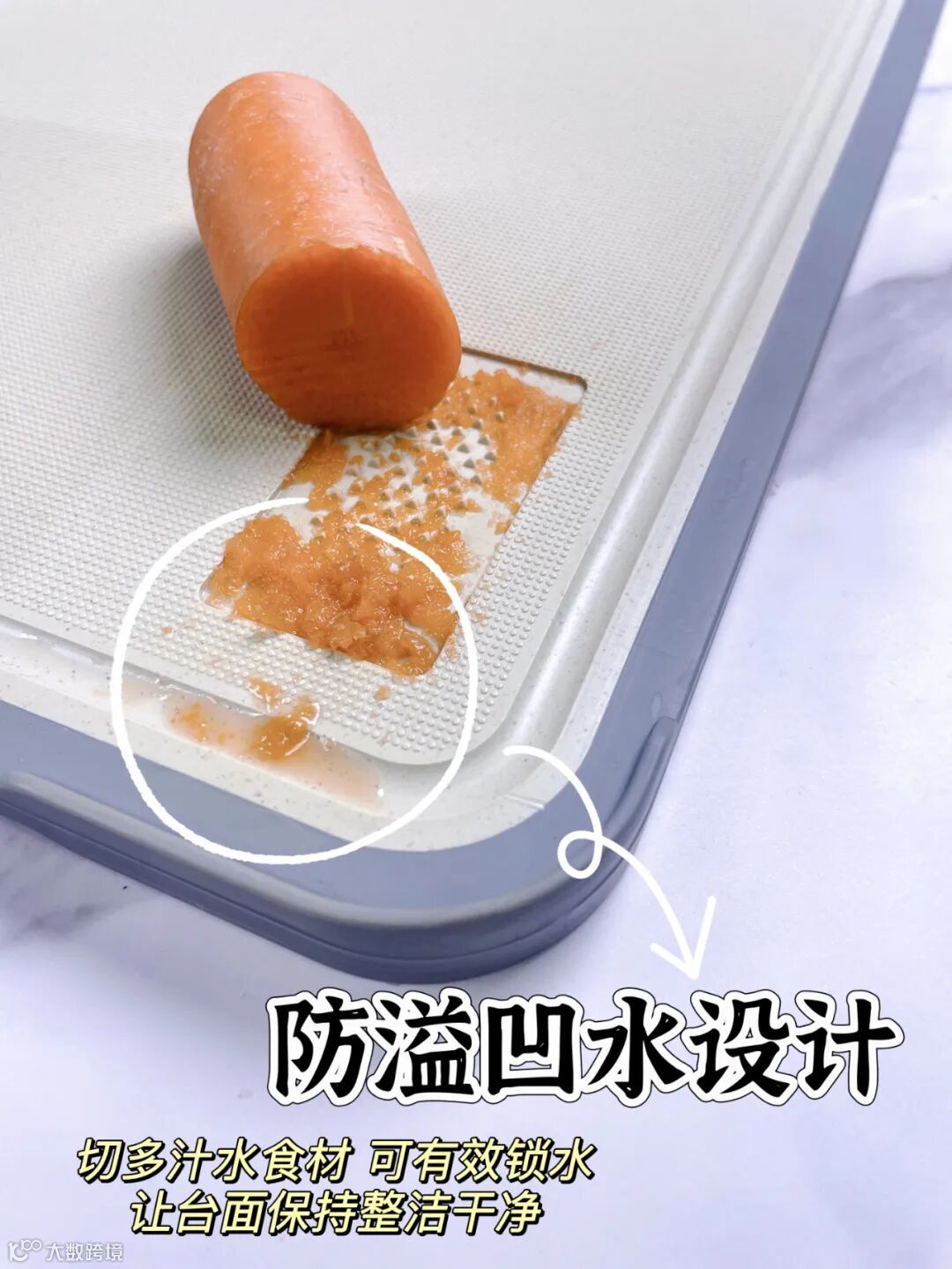 这款菜板就没有这种忧虑。它有防溢水凹水槽,汁水不会流到外面,放心大胆地切,再多汁水也不怕。