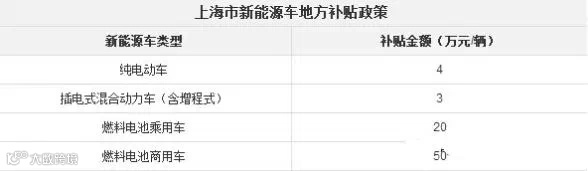 上海市政府2014年5月发布的《上海市鼓励购买和使用新能源汽车暂行办法》中规定,对纯电动乘用车的补贴额度为4万元/辆,对插电式混合动力乘用车(含增程式)的补贴额度为3万元/辆,补贴力度和旧办法一致。而对于燃料电池汽车,新办法规定,燃料电池乘用车和商用车的补贴标准则分别高达20万元/辆和50万元/辆。