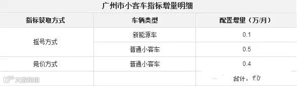 广州市自2013年7月1日实施的《广州市中小客车总量调控管理办法》中规定,广州市小客车增量指标为每周期12万个(12个月为一个配置周期)。增量指标按照1:5:4的比例配置,即每个配置周期内,以摇号方式配置的节能车增量指标为1.2万个,以摇号方式配置的普通车增量指标为6万个,以竞价方式配置的普通车增量指标为4.8万个。单位增量指标占配置额度的12%,个人增量指标占配置额度的88%。
