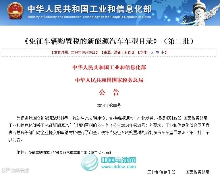中国电池杂志-中国电池网10月29日讯(肖何 北京报道)29日工信部和国家税务总局联合发布第二批《免征车辆购置税的新能源汽车车型目录》。