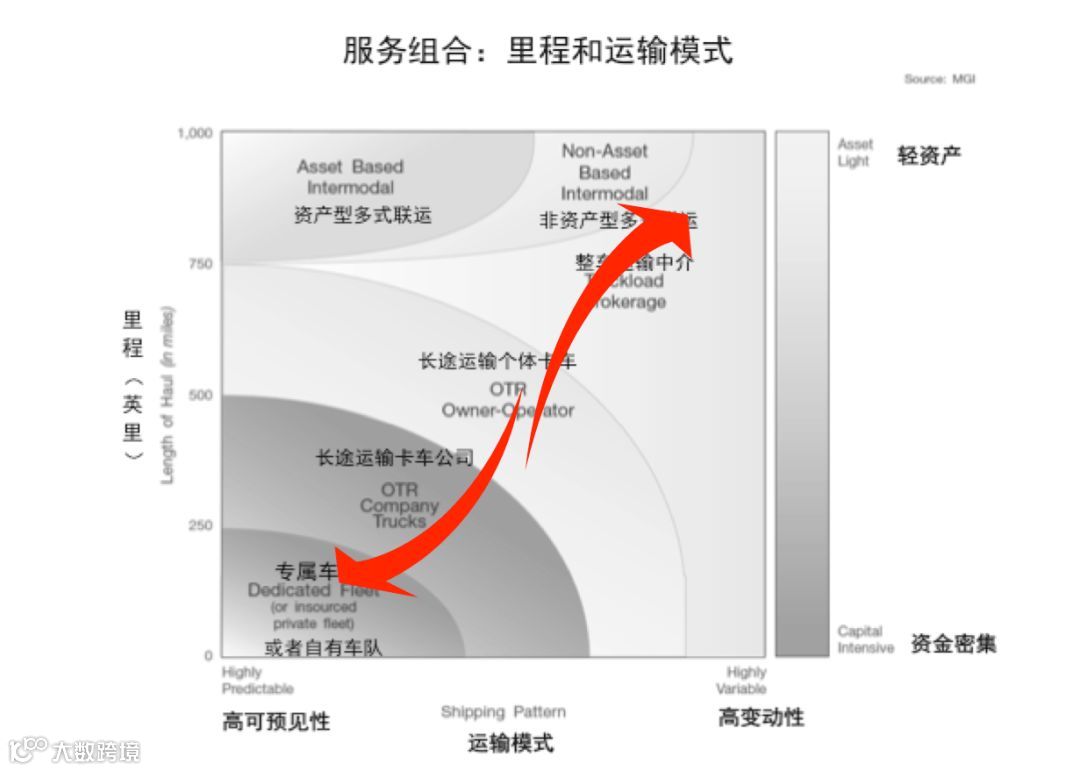 在2014年那个车货匹配概念如火如荼的情况下,整车市场的创业者们直接对标美国的C.H.Robinson,想以轻资产的方式想在中国打造一个无车承运人平台,而往左下角重资产发展的自有车队、专属车队鲜有人问津。
