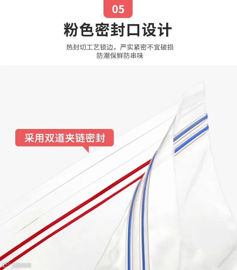 采用双层咬入式夹链封口设计,咔咔一下轻松密封,光听声音就知道有没有密封好。双封条设计,不易漏气,增强阻气密闭性,防止内包物被氧化受潮,优化保鲜,存放效果~
