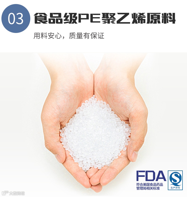 食品级PE材质安全无毒无味,手感似蜡,具有优良的耐低温性能(最低使用温度可达-70~100°C),不含双酚A,健康环保材质可直接接触食品,清洁卫生!