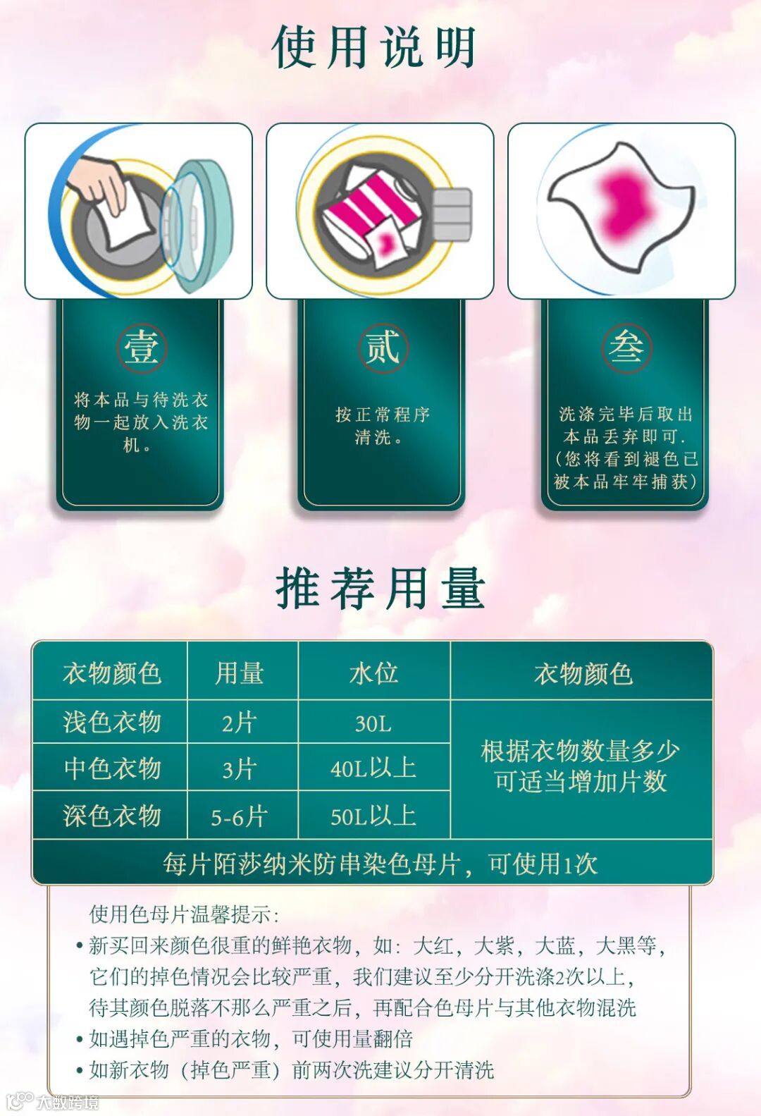 洗衣服的时候,丢一片进去,能轻松捕捉游离的色彩粒子、重金属粒子,防止衣物串色 。