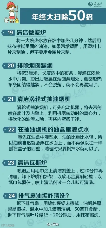 春节年前大扫除必备50招,省时省钱省力!洗衣机、饮水机怎么清洁?如何简单清除厨房油渍?50个小技巧让家变得更干净!赶紧行动起来,春节前做个大扫除吧。