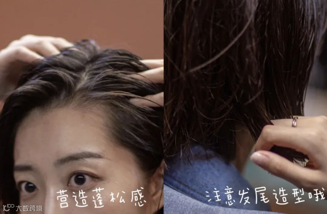STEP3:最后用手抓捏出自己想要的头发造型,手法上要注意发根抓取蓬松,发尾处收紧。