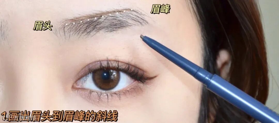 STEP1:画出眉头到眉峰的斜线,眉峰为眉头最低处向上倾斜30°的位置。