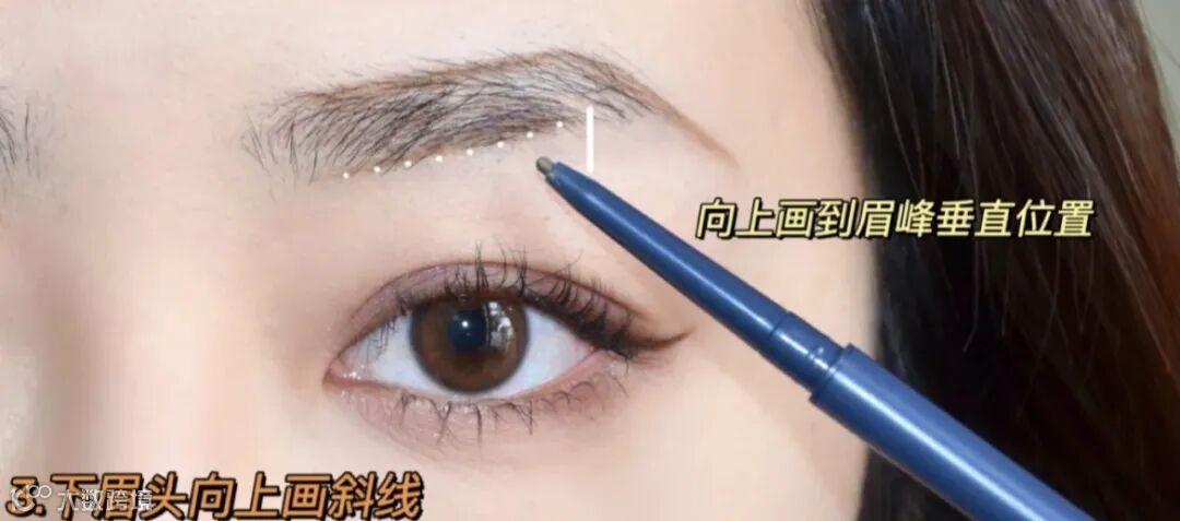 STEP3:下眉头向上画斜线,画到眉峰垂直位置。