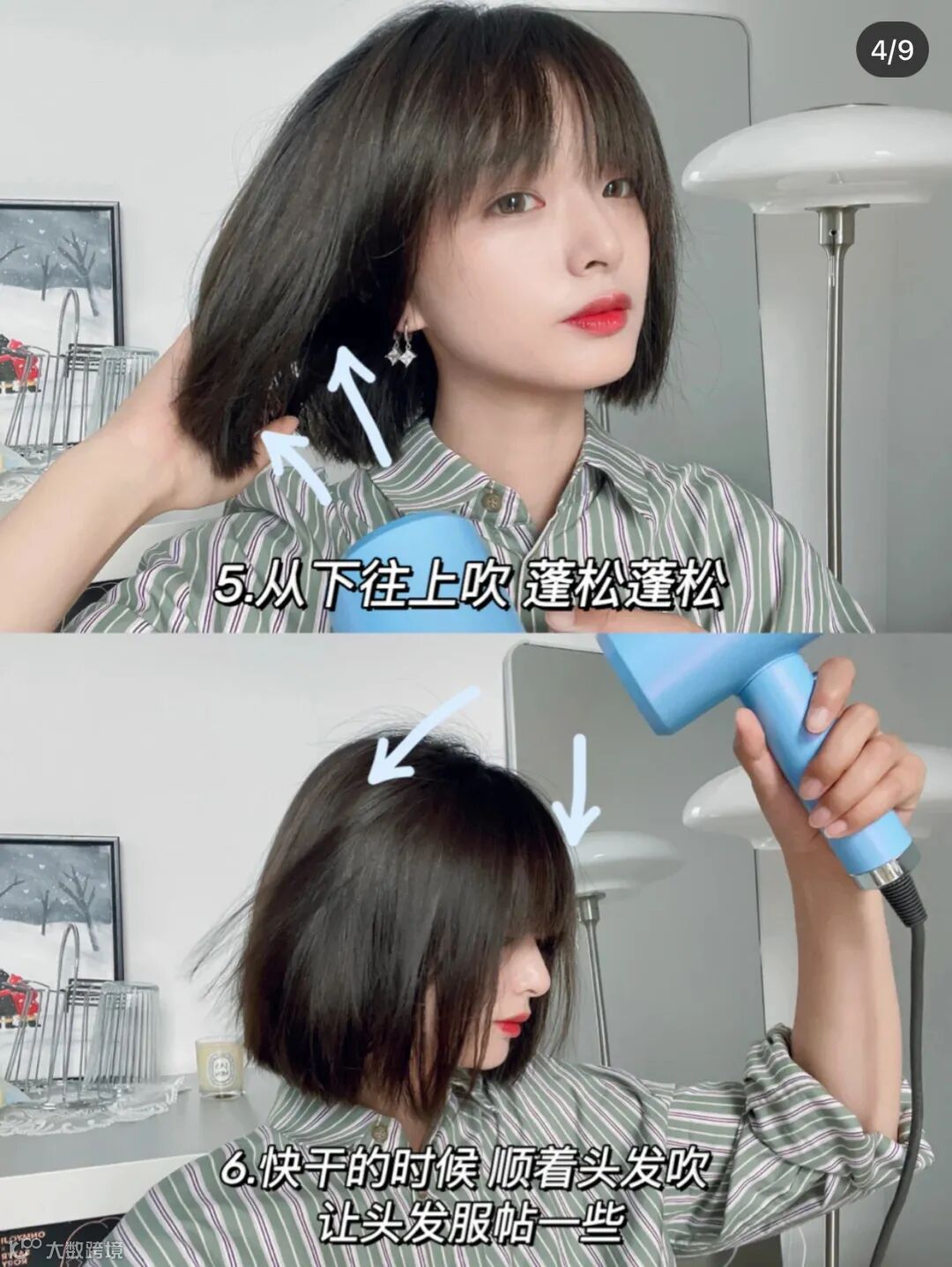 STEP3:从下往上吹,让头发显得更加蓬松。快干的时候,顺着头发吹让头发更服帖柔顺。