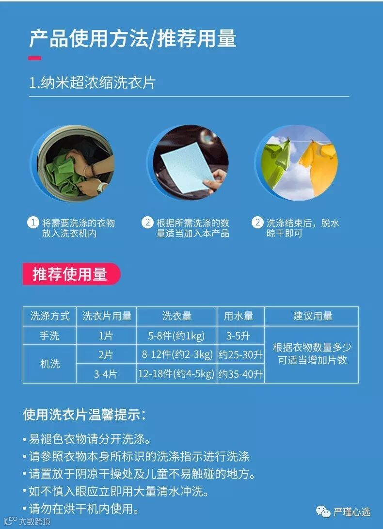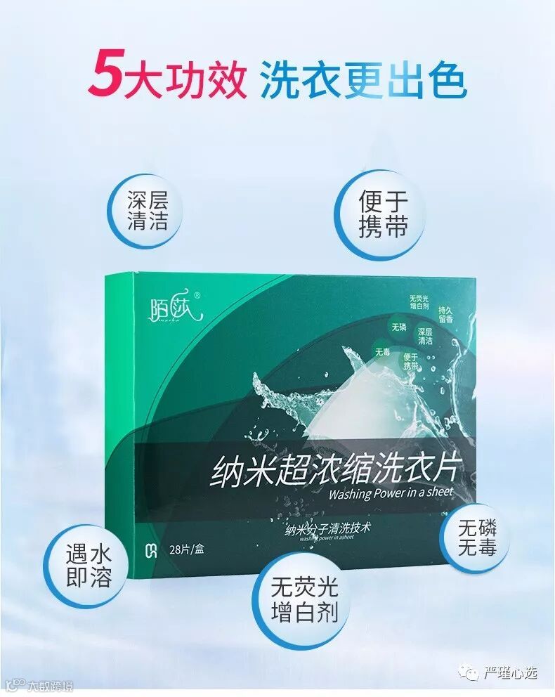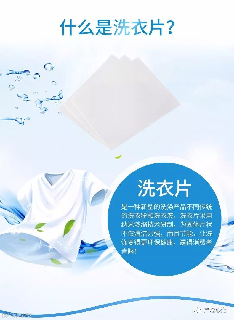 纳米超浓缩洗衣片:是一种新型的洗涤产品,不同传统的洗衣粉和洗衣液,洗衣片采用纳米浓缩技术研制,为固体片状。不仅清洁力强,而且节能,让洗涤变得更加环保健康,具有5大功效:深层清洁,便于出差携带(可上飞机),遇水即溶,无荧光增白剂,无磷无毒!