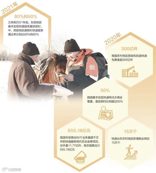 国家邮政局明确提出,继续深入推进“快递进村”,力争到2021年底,东部地区基本实现快递服务直投到村,中、西部地区建制村快递服务通达率分别达80%和60%。