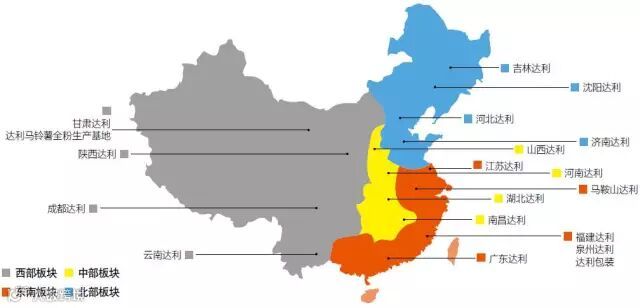 目前,达利有六大类产品,涵盖糕点、薯类膨化食品、饼干、凉茶、复合蛋白饮料及功能饮料,超过720个单品以及107个饮料单品,产品链条广而深。与之匹配的是18家子公司、30个食品饮料生产基地和3847家经销商。它们以福建为中心,逐渐辐射全国,就像一张大网,覆盖国内一至三线城市。