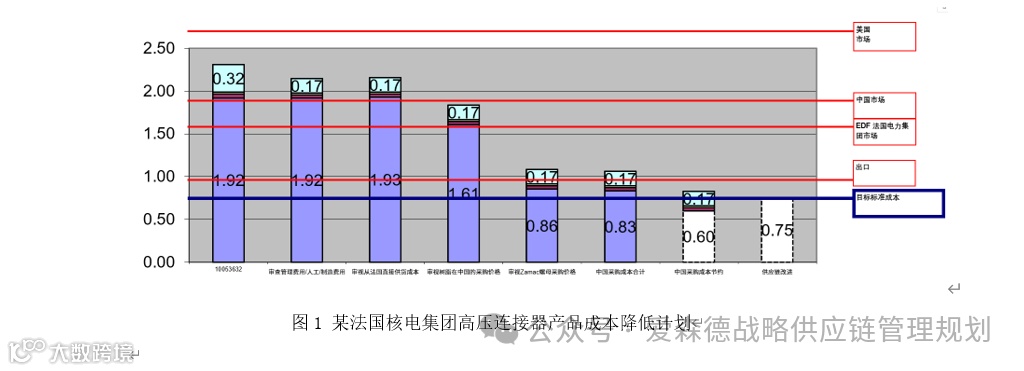 图1显示的该集团某一产品的成本削减计划。红线显示该产品在不同目标市场及客户的目标销售价格,如美国、法国电力集团,中国市场,其它出口市场。蓝线显示产品的目标标准成本为0.75美元。为达成不同市场的目标利润,该集团计划实施的各种成本削减举措。这些举措包括: