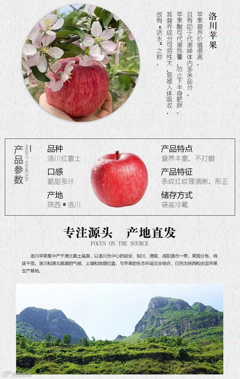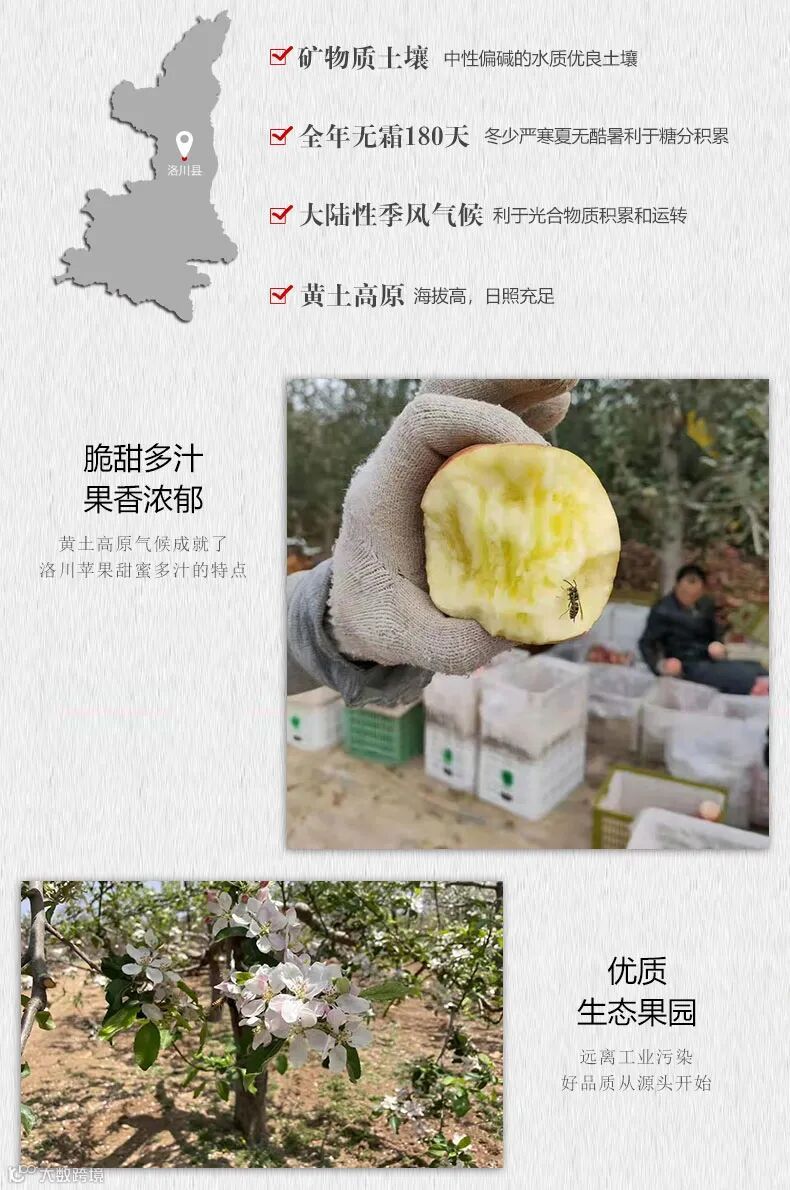 洛川县海拔较高,光照充足,昼夜温差大,雨热同季,是符合苹果最适宜生产区7项气象指标要求的苹果优生区,洛川苹果果型端正美观,大小一致;底色黄绿,充分着色时,全面浓红或鲜红色,着色均匀;果点小,果面光滑,色泽鲜亮;蜡质多,果粉多,果梗较短、中粗;果肉黄白色,肉质细嫩致密,有淡淡的果香味,汁多松脆,有蜂蜜味,酸甜适口。