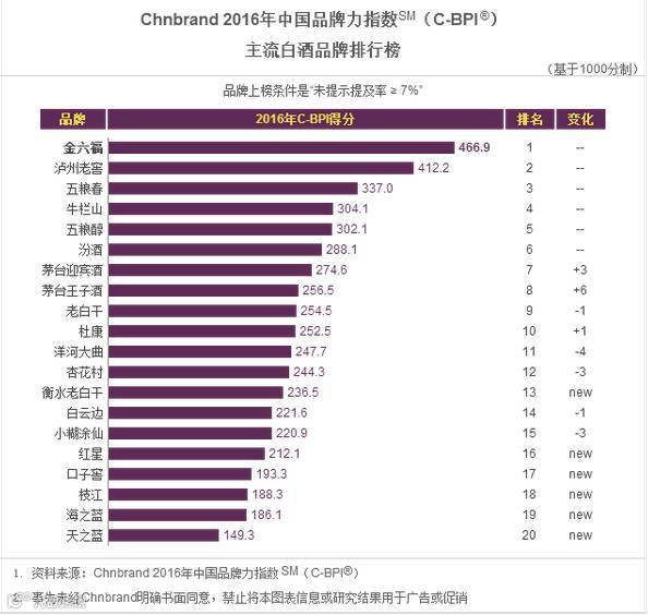 前二十名:金六福、泸州老窖、五粮春、牛栏山、五粮醇、汾酒、茅台迎宾酒、老白干、杜康、洋河大曲、杏花村、衡水老白干、白云边、小糊涂仙、红星、口子窖、枝江、海之蓝、天之蓝