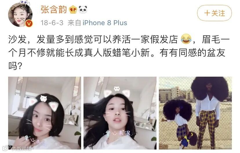 就连张含韵本人也常常吐槽自己发量多到感觉可以养活一家假发店,眉毛一个月不修就能长成真人版蜡笔小新。