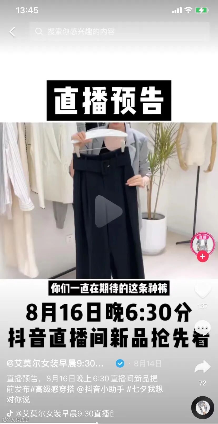 通过发布短视频对直播进行预告,给直播间引流。因此要注意该视频的封面和文案,要清楚的告知用户本场直播的时间;视频主题是产品的卖点、性价比、福利;在直播前一两天到直播时持续发布。