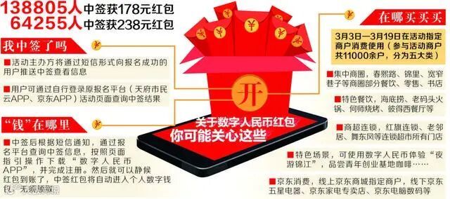 3月3日, #数字人民币#话题登上微博热搜榜 。消息面上,备受关注的4000万元成都数字人民币红包今起就可以正式使用了。203060名中签的个人,从今日零时起就可以使用数字人民币红包,在成都五大消费场景、11000余户参与活动的商家使用,体验更多“成都味儿”。