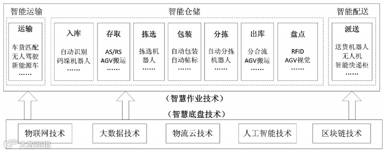 3]。按照物流服务环节不同,我们将智慧物流“仓运配”环节所涉及到的技术分为智慧底盘技术和智慧作业技术两大类。智慧底盘技术包含物联网、大数据、物流云、人工智能和区块链等; 智慧作业技术包含智能运输、智能仓储及智能配送等相关技术。