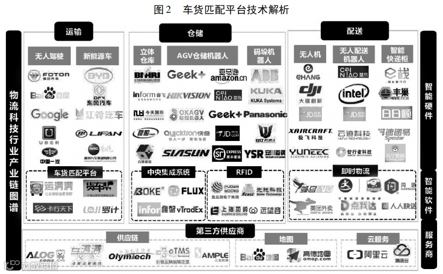 面对新时代物流智慧化的发展趋势,如何整合传统和新兴物流科技去提升物流智能化程度是每个企业必须重点关注的问题,也是其能否在未来的市场竞争中占据优势地位的关键所在。当前国内针对智慧物流“仓配运”环节科技产业应用图谱如图 3 所示,各家电商平台企业、领先物流企业及第三方物流服务企业都在积极谋划,依托企业自身特点和优势,布局智慧物流各新兴技术领域,力图占得市场先机。