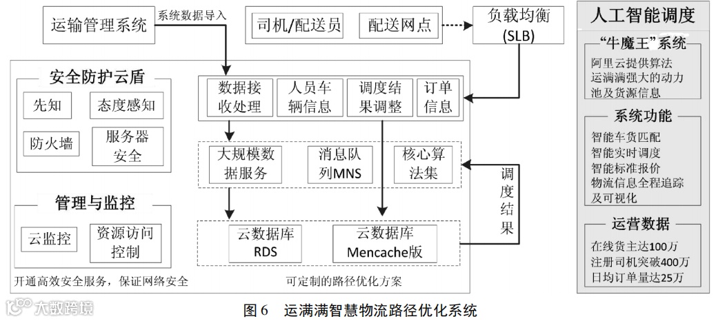 (三) 运满满———第三方物流服务企业运满满专注于干线整车车货信息匹配和运力智能调度市场,2016 年底携手阿里云发布的“牛魔王”人工智能调度系统,是国内首个基于大数据、云计算、人工智能和移动互联网技术开发的货运调度平台,为司机和货主提供实时车货信息匹配、标准报价、实时调度、物流信息全程追踪和可视化等服务,显著提升了公路干线物流车辆、货源、速度、精准度和运输组织效率,减少货运空载率,具体运营流程如图 6 所示。