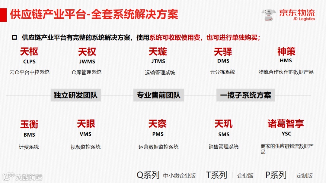 5. 大数据分析系统: 实现智能仓库选址、智能分仓备货和智能补货等动态业务。在未来,京东将继续加大物流技术创新的投入力度,依托已有的 SAAS 化的信息系统,通过智能算法服务和组件化的业务应用,致力于成为领先的零售基础设施服务商,向全社会提供高智能、低成本、高效率的智慧物流供应链解决方案。