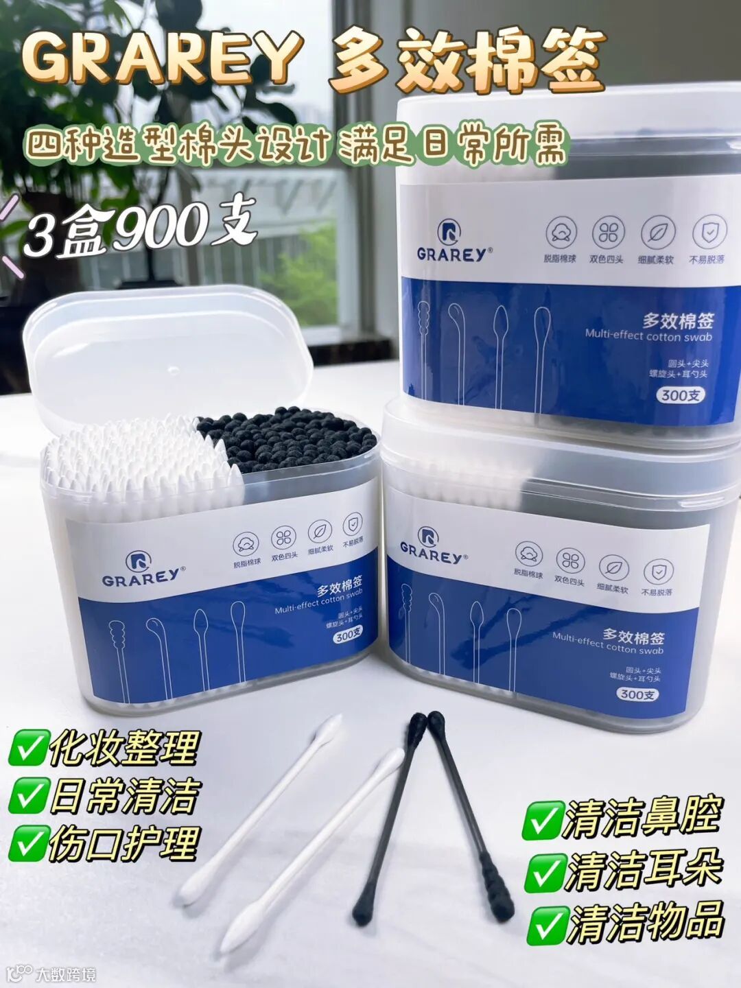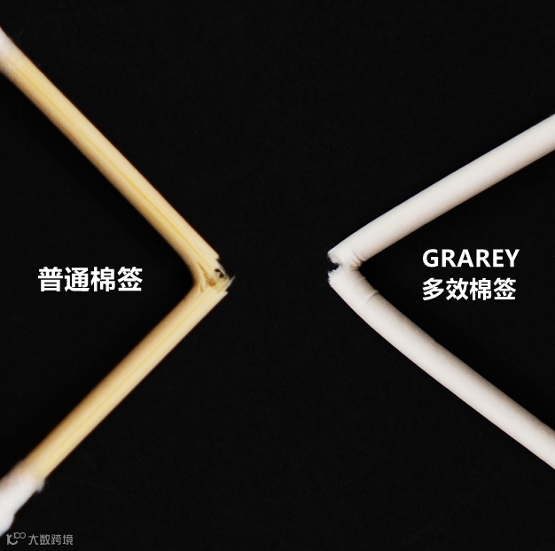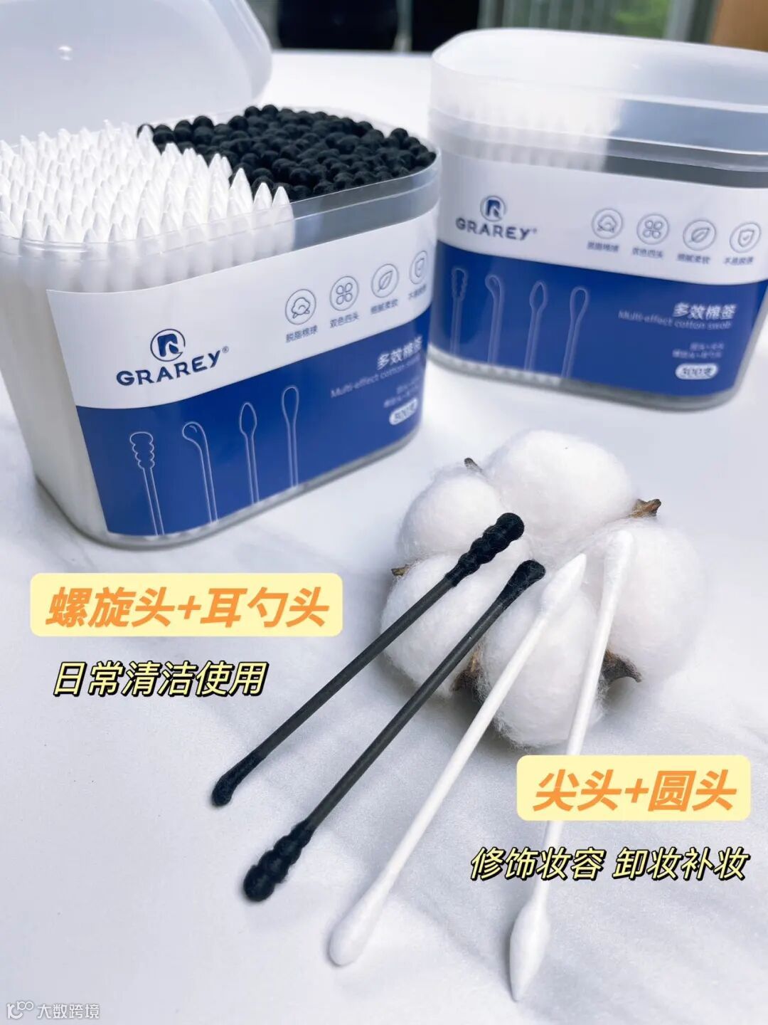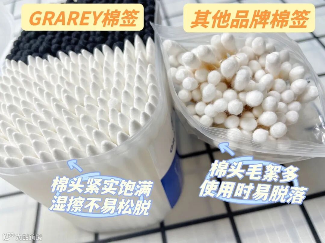 GRAREY这款多效棉签不同于传统的棉签,棉签头选用天然脱脂棉精制而成,棉丝细密,不易掉絮、无毛刺,比普通棉花容易吸收液体。