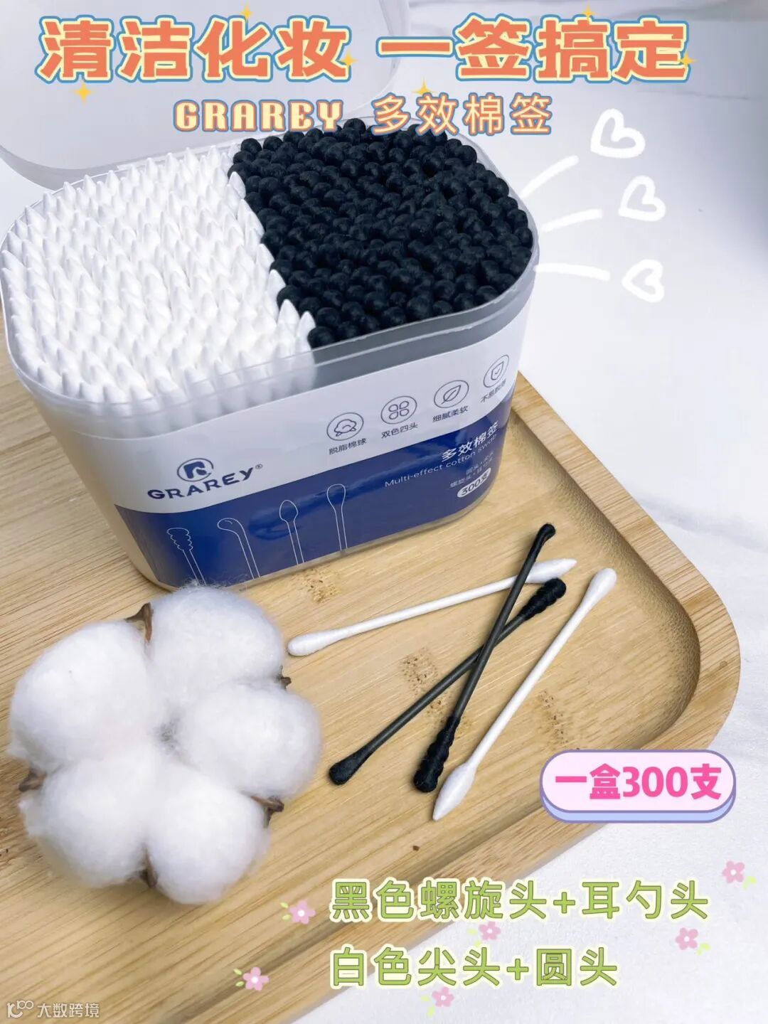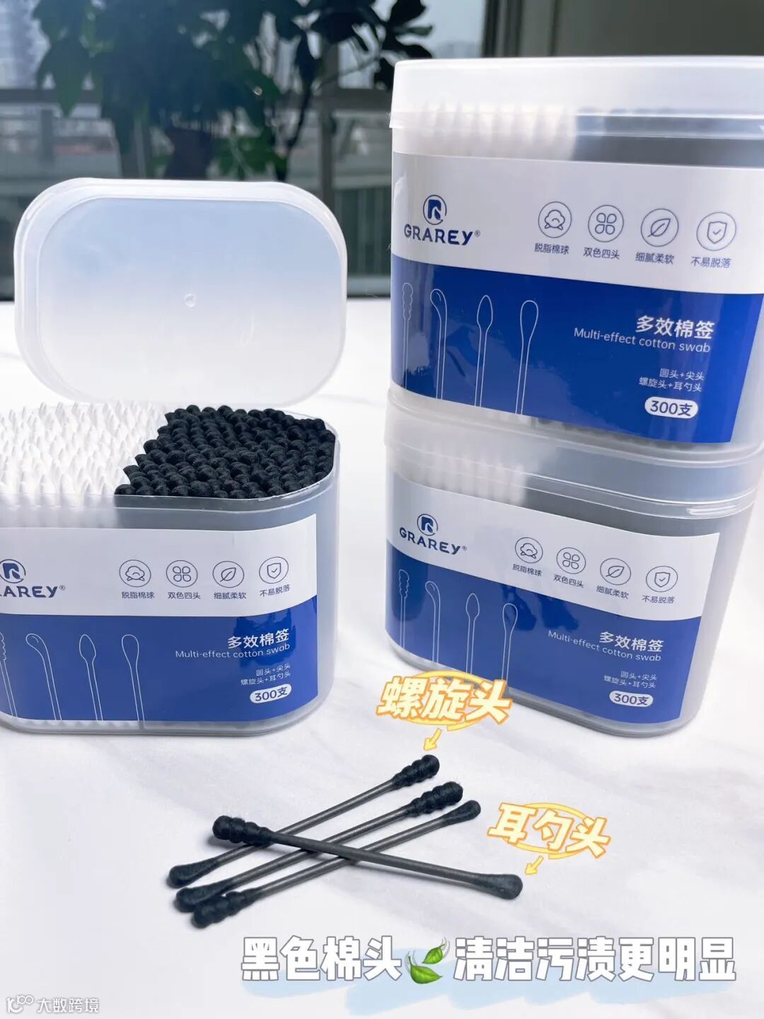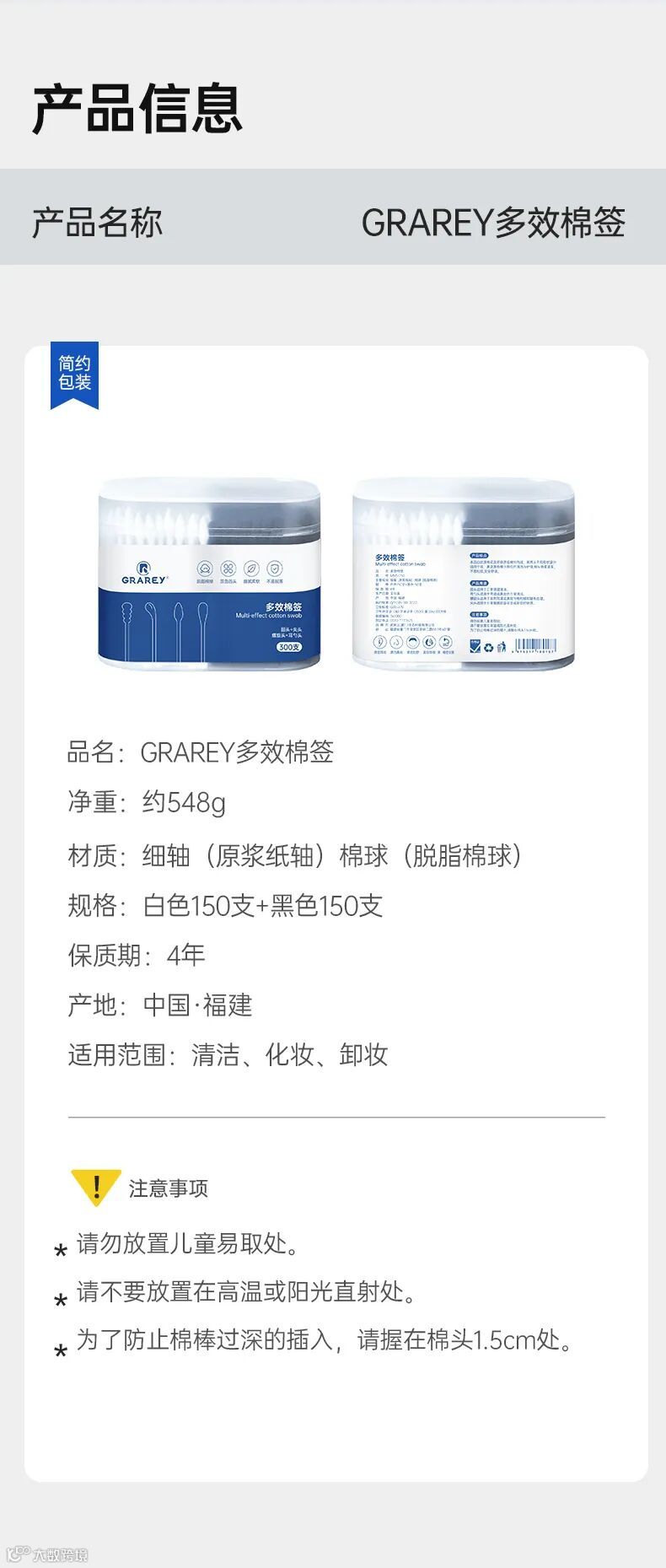 GRAREY这款多效棉签不同于传统的棉签,棉签头选用天然脱脂棉精制而成,棉丝细密,不易掉絮、无毛刺,比普通棉花容易吸收液体。