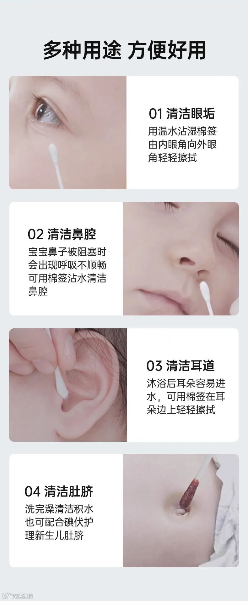 不同的用处,选择不同形状的棉头,可以减少棉签对孩子的伤害~