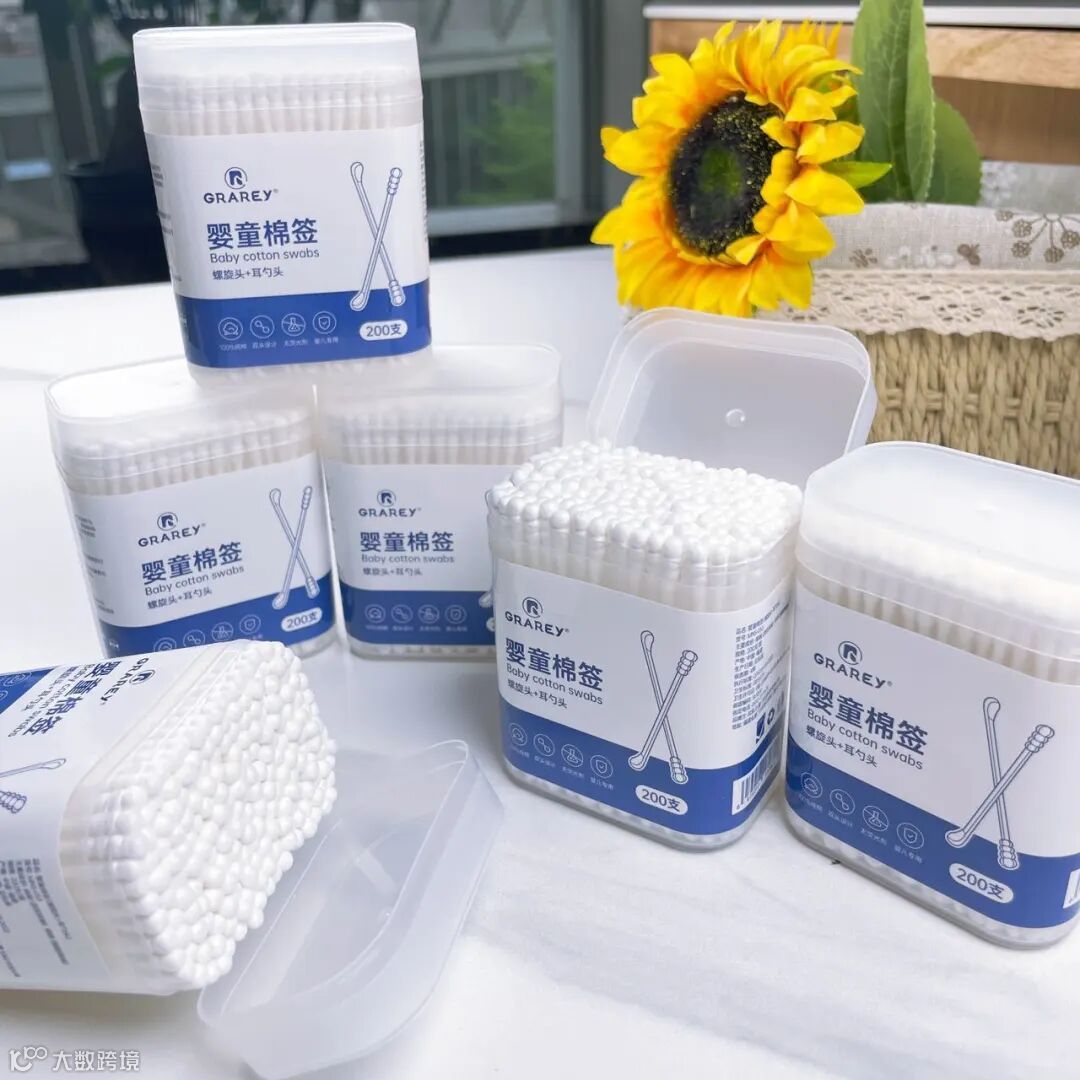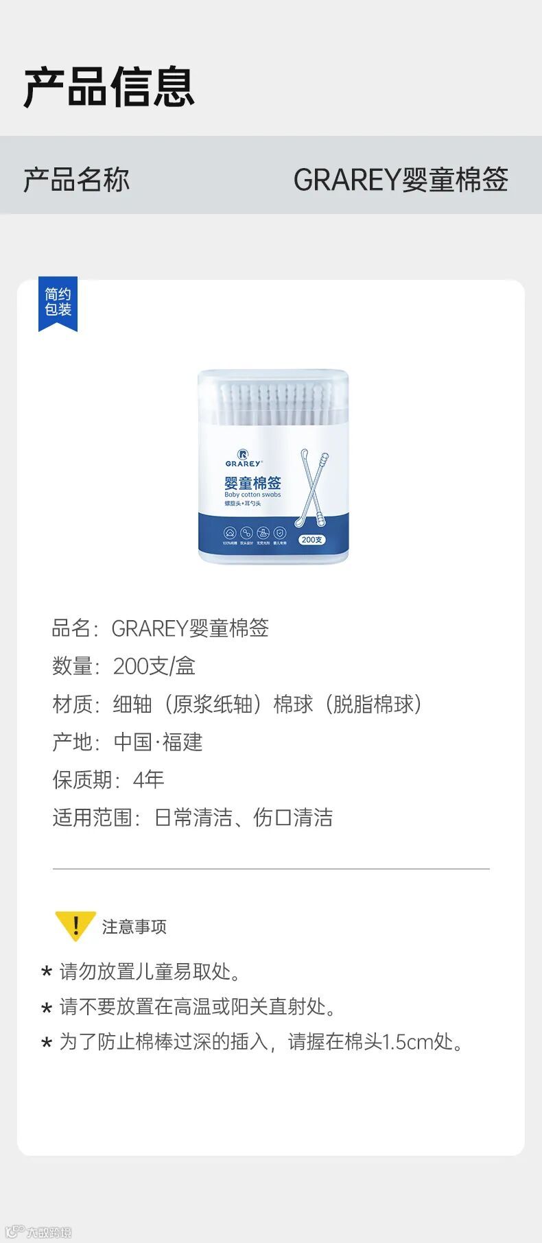 GRAREY这款婴童棉签采用100%天然纯棉,完全的零添加无荧光无异味,绵柔亲肤不伤宝宝娇嫩肌肤。