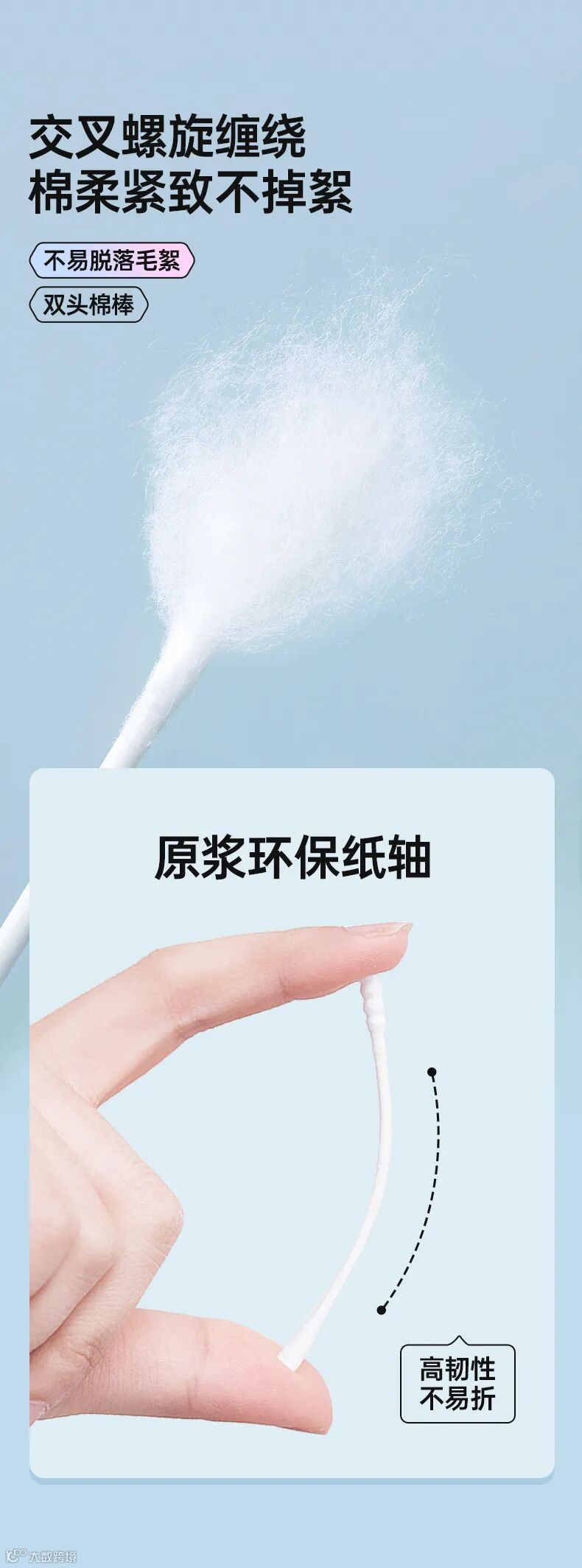同时,采用韧性高、环保的木浆纸轴作为棉棒,整体光滑无毛刺,抗弯曲很强,软硬适中,使用更顺手、方便