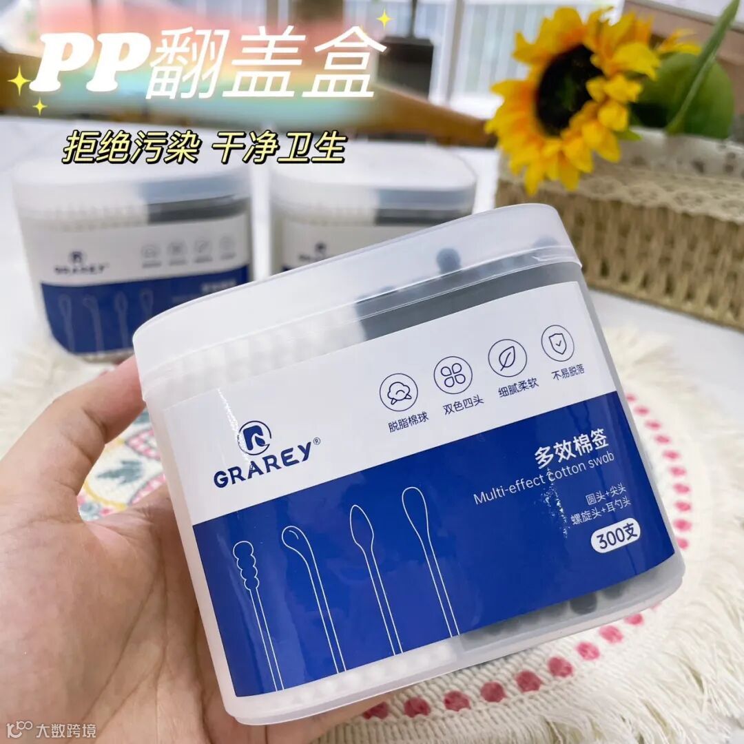 一盒为300支装,包装使用PP翻盖盒进行包装,自带隔板分区,棉签拿取不易混淆,用完合上盖子,一秒隔绝污染!