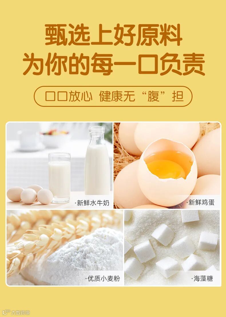 广受好评的内在奥秘在于用心,选好食材才能做出美味来。可爱的造型让人不禁眼前一亮,用料考究。坚持不采用乳粉,采用12%水牛奶,58%鸡蛋含量等,做出来的蛋糕奶味纯正,醇香丝滑,既能代餐又补钙~